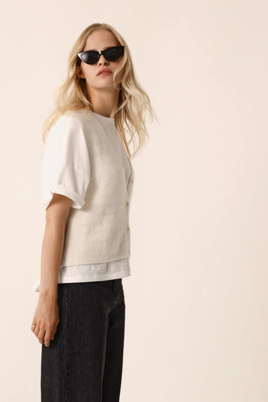 La tendance rétro continue son ascension et s’installe dans notre dressing d’hiver avec ce gilet sans manches Bernie en alpaga superfine. Coupe droite pour un look boyfriend, portez-le ouvert ou fermé sur une chemise longue pour une silhouette contemporaine. • Gilet sans manches en alpaga superfine • Encolure V boutonnée • D devantétails ajourés • Finitions en bord-côte • Robe pull réalisée dans un nouveau fil italien du groupe « Mousseux » composé d’Alpaga Superfine du Pérou pour sa texture moelleuse et chaude et de polyamide recyclé ajoutant de l’élasticité • Coloris Crème : un blanc crème • Modèle dessiné à Paris par notre styliste • Fabriqué en Italie • Longueur : 53 cm pour une taille 1 • Jolien mesure 1m76 et porte une taille 1 • Conseil style : portez-le avec une chemise et la jupe longue Siara