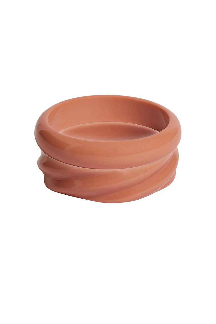 Tendance à suivre de très près, les bijoux vintage continuent leur ascension mode cette saison avec ce set de 2 joncs Maneal en acétate. Bombé pour l’un et gravé dans l’esprit d’une vague pour l’autre, ils se poseront joliment à votre poignet. • Joncs en acétate bombé et gravé • Finition brillante • Ces bracelets s’enfilent et existent en taille unique • Coloris Coing : un rose pêche • Ø 6,5 cm • Livré avec un pochon de rangement • Exclusivité DPH x Feeka
