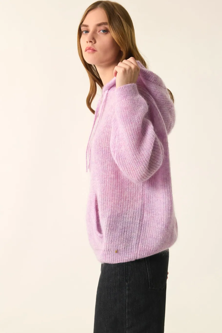 Esprit sweat de sport revisité avec sa capuche et sa poche kangourou, le pull Bulotte prend la forme d’un hoodie. Porté sous un manteau oversize avec votre jean préféré, sa maille en kid mohair ultra douce sera parfaite pour le plein hiver. • Pull hoodie oversize • Emmanchures décalées • Capuche avec cordon de serrage • Poche plaquée devant • Finitions en bord-côte • Pull femme réalisé en fil du nouveau groupe « Mohair » composé de Kid Mohair d’Afrique du Sud et laine d’Australie. Fil certifié RMS & RWS et garanti sans Mulesing. • Coloris Pétale chiné : un rose chiné • Modèle dessiné à Paris par notre styliste • Longueur : 56 cm pour une taille 1 • Iolanta mesure 1m71 et porte une taille 1 • Conseil style : portez-le avec le jean Louisette et le manteau oversize Yvie