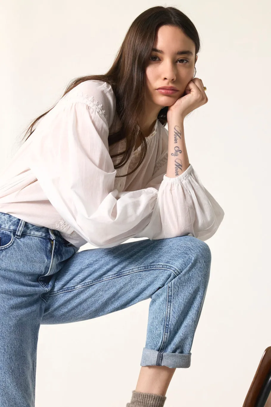 Ponctuée de détails de broderie, la blouse Renee c’est le modèle bohème chic et versatile que vous porterez tout l’automne-hiver. En coton doux et léger, portée avec un jean ou un pantalon de tailleur, elle s’accordera avec tout. • Blouse manches longues en coton • Détails de broderie sur le col, aux épaules et devant • Bas de manches froncés élastiqués • Finitions froncée • Coloris Écru : un blanc écru hivernal • Modèle dessiné à Paris par notre styliste • Longueur : 60 cm pour une taille 1 • Sofia mesure 1m70 et porte une taille 1 • Conseil style : portez-la avec un jean large et les bottines Papilla pour un look bohème chic