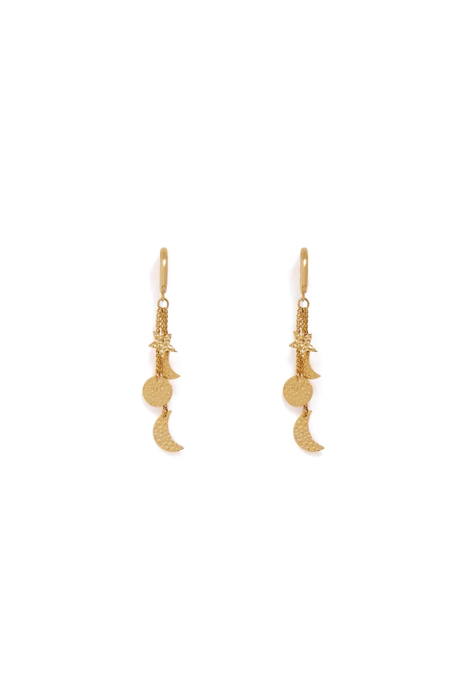 La tendance astro gagne nos boîtes à bijoux avec les boucles d’oreilles Meloe. Dorées à l’or fin, lunes, soleil et médaillon ornent leurs chaînes fines. Imaginées comme des grigris, adoptez la tendance asymétrique en ne portant qu’une seule de ces boucles d’oreilles. • Boucles d’oreilles pendantes • Chaînes maille de forçat à pendentifs lune, étoile et médaillon martelés • Fermoir à cliquet • Adaptées aux oreilles percées • Longueur totale : 5 cm • Livrées avec un pochon de rangement • Exclusivité DPH x Feeka