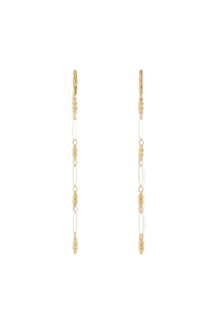 Ayant le pouvoir de sublimer un look et habiller un visage, les boucles d’oreilles Moreno s’inscrivent dans la tendance minimaliste avec leur pendant fait de perles dorées et maillons émaillés. • Boucles d’oreilles pendantes • Perles dorées et maillon émaillés • Finition brillante • Fermoir à cliquet • Adaptées aux oreilles percées • Coloris Écru : un blanc écru • Longueur totale : 8 cm • Livrées avec un pochon de rangement • Exclusivité DPH x Feeka