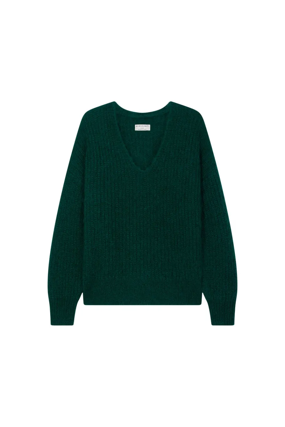 Petit basique chic facile à coordonner à une jupe ou un pantalon, le pull col V Charlie opte pour une palette de coloris naturels très en vogue cette saison. En kid mohair doux et cosy, sa maille côtelée et son encolure mettront en valeur votre silhouette. • Pull droit côtelé • Encolure V • Finitions en bord-côte • Pull réalisé dans un nouveau fil italien du groupe « Fluffy » en kid mohair d’Afrique du Sud et laine mérinos extrafine d’Australie certifié RMS & RWS. Fil au toucher très doux, gonflant et duveteux. • Coloris Toundra : un vert sapin • Modèle dessiné à Paris par notre styliste • Longueur : 60 cm pour une taille 1 • Josie mesure 1m77 et porte une taille 1 • Conseil style : portez-le rentré dans le jean Lulu avec un manteau long pour une silhouette cosy et citadine
