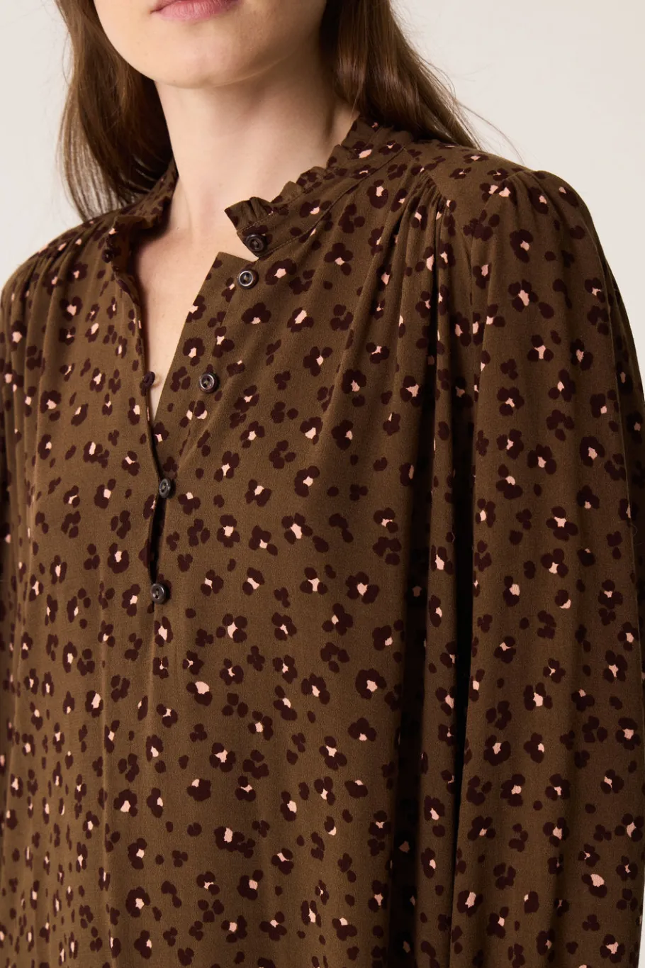 Viscose fluide et légère, originalité d’un motif léopard modernisé, la robe manches longues Solene adopte une coupe oversize et une longueur dessus du genou pour l’automne-hiver. • Robe courte ample en viscose imprimée • Coupe droite • Manches longues à poignet bracelet • Col rond volanté à patte de boutonnage • Finitions froncées • Imprimé exclusif Des Petits Hauts « Léo kaki » offrant une interprétation contemporaine du motif emblématique léopard dans des nuances de brun et de beige sur un fond kaki • Modèle dessiné à Paris par notre styliste • Longueur : 92 cm pour une taille 1 • Kryzia mesure 1m70 et porte une taille 1